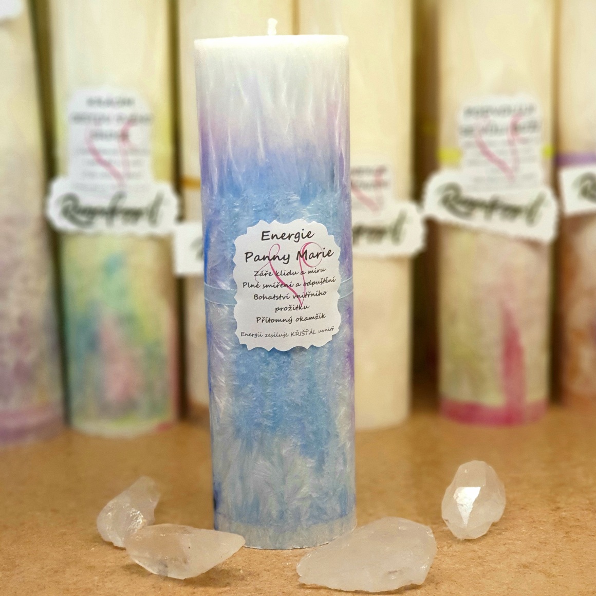 Energie Panny Marie - Energetická svíčka s křišťálem z palmového vosku s RSPONení skladem1 150 Kč/ ks