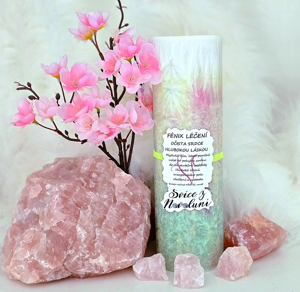 Svíčka Fénix léčení - Očista srdce hlubokou láskou je symbolem hluboké očisty a mystické transformace, která vychází ze samotného středu našeho bytí. Nese v sobě sílu mystického fénixe, který s jemností a moudrostí spaluje vše, co již dosloužilo, aby se mohlo zrodit nové – jasné, čisté a pravdivé.