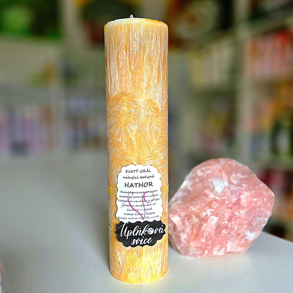 🕯️ Energetická svíčka s křišťálem – Svatý grál milující bohyně HATHOR 🕯️